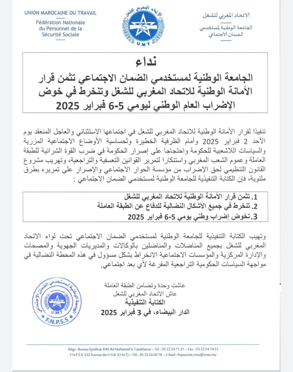 توصلت جريدة الرؤية بالبلاغ التالي من السيدة لالة السالكة بابا ممثلة مستخدمات ومستخدمي الضمان الاجتماعي بجهة العيون وعضو الكتابة التنفيذية في الجامعة الوطنية لمستخدمي الضمان الاجتماعي المنضوية تحت لواء الإتحاد المغربي للشغل: