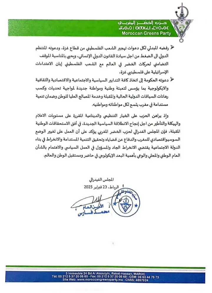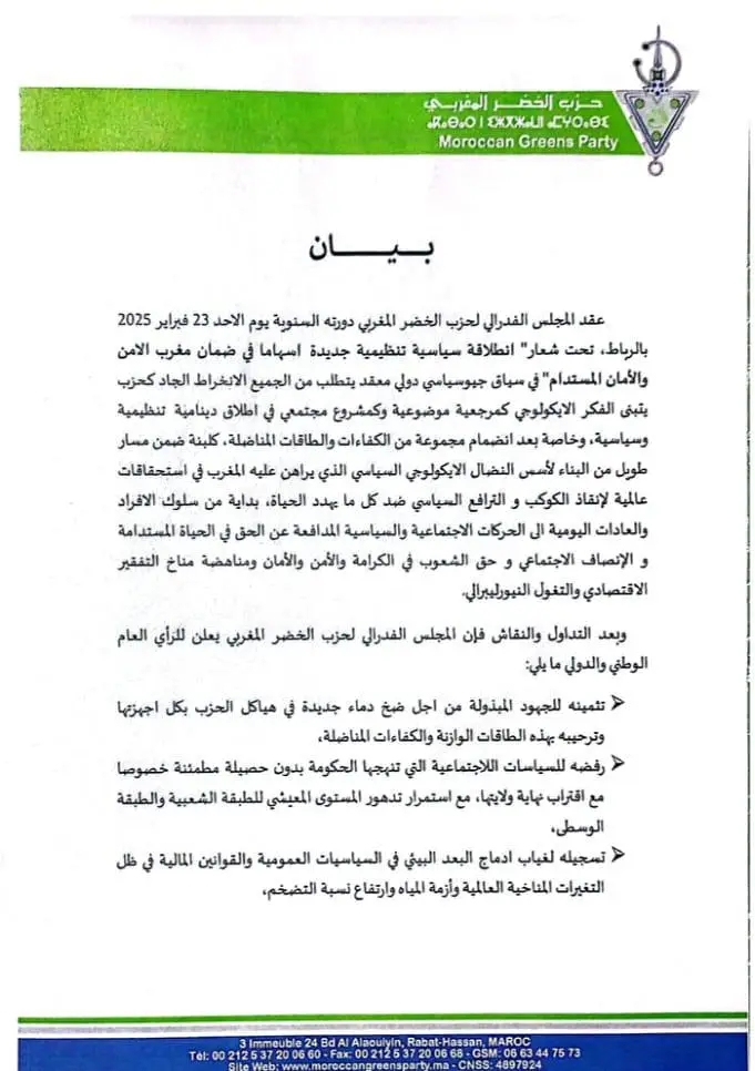 عقد المجلس الفدرالي لحزب الخضر المغربي دورته السنوية بالرباط و اصدر البيان التالي: