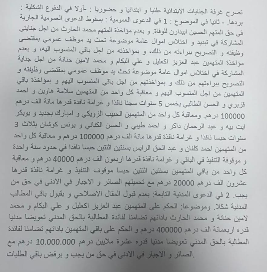 – الحكم على المتهمين عبد العزيز العليل وعلي البكام ومحمد لامين حنانة ومحمد الحارث بأدائهم تضامنا لفائدة المطالبة بالحق المدني تعويضا مدنيا قدره 400 ألف درهم.