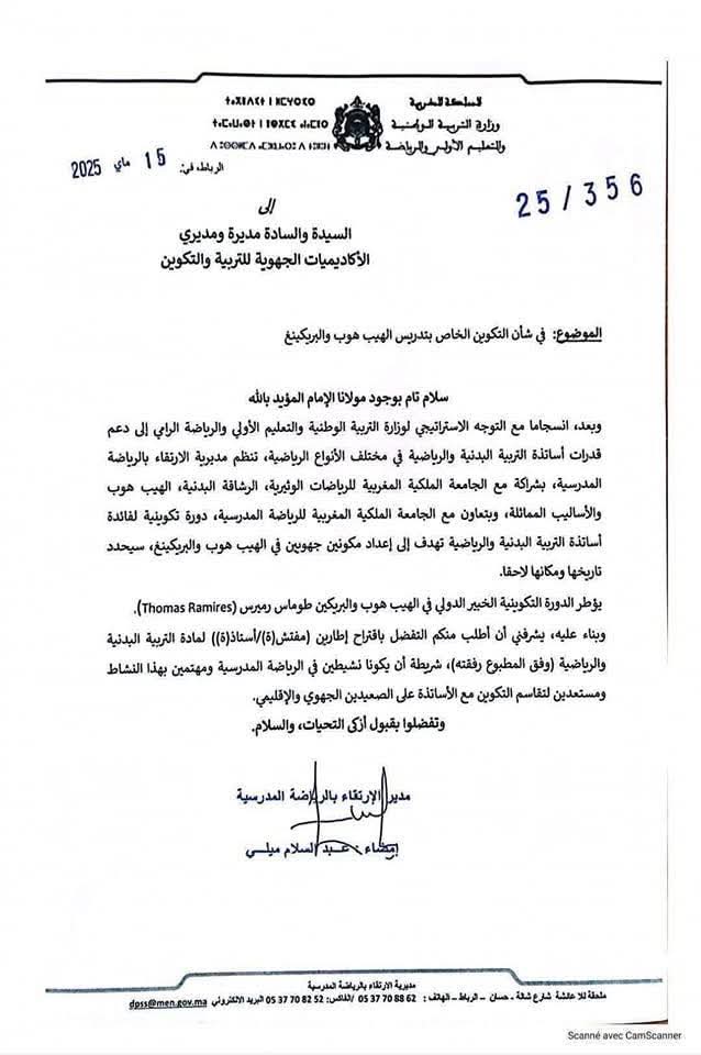 عممت وزارة التربية الوطنية مذكرة على السادة مديري الأكاديميات الجهوية للتربية و التكوين بخصوص التكوين الخاص في الهيب هوب و البريكينغ،هذا نصها: