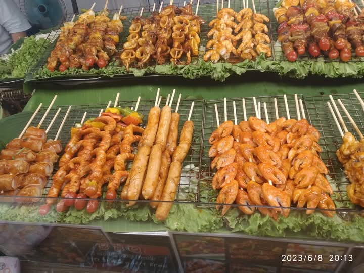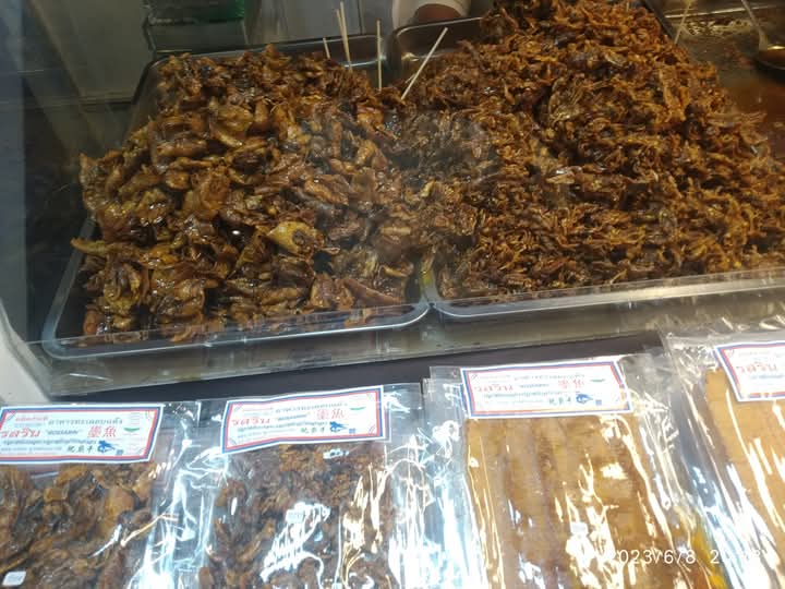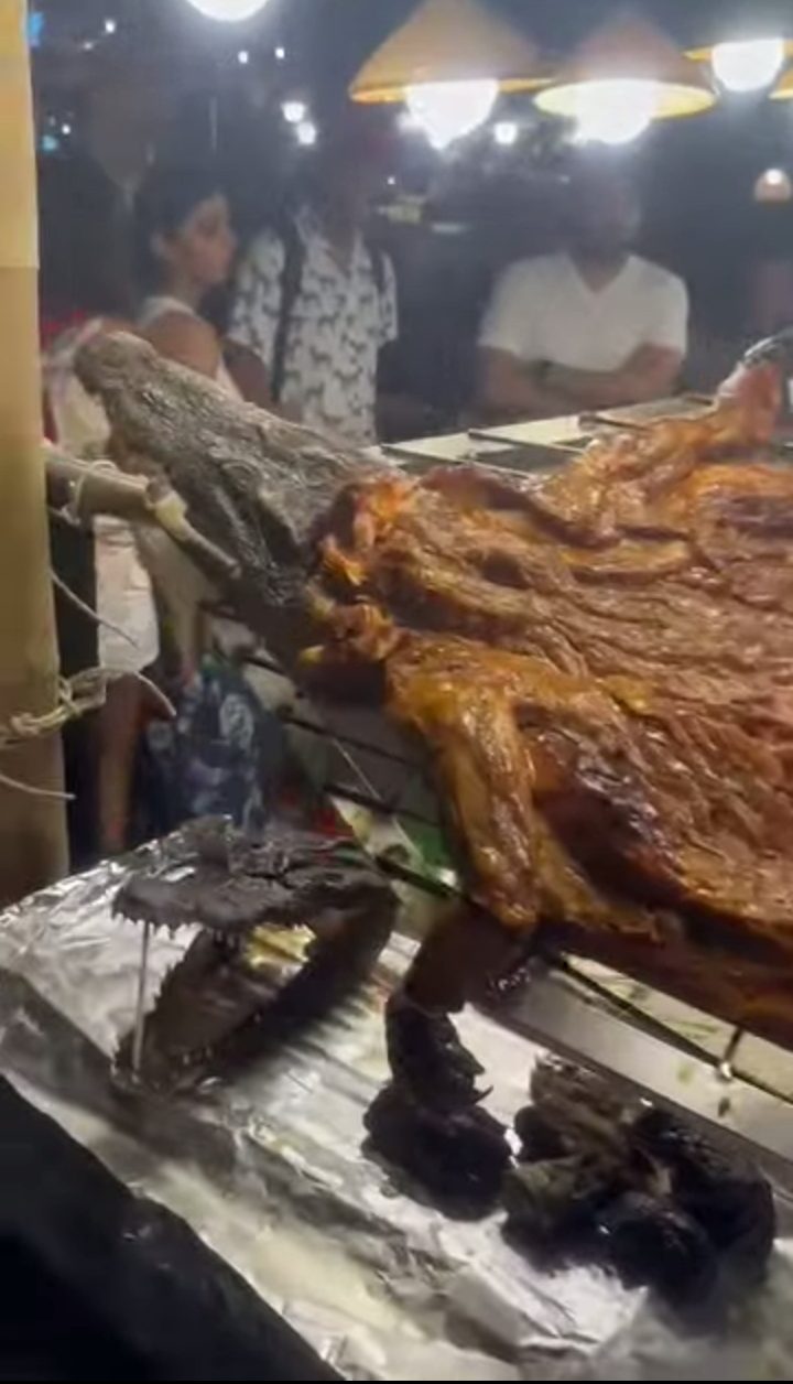 ومن عجيب الصدف ان نكون في جولة انا وبعض الاصدقاء المرافقين ،لنجد تمساحا مدبوغا معلقا يتم طهيه على نار هادئة ،ويتم اخذ اللحم منه لوضعه سندويشات ورائحة المكان غير مقدور على تحملها .